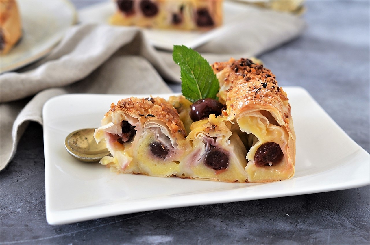 Ungem fiecare foaie de plăcintă cu unt topit, folosind o pensulă de patiserie. Suprapunem astfel 3 foi. În partea de jos a foilor de plăcintă, pe lungime, sprităm cu poșul un strat generos de cremă de vanilie. Punem apoi vișinele peste crema de vanilie, una lângă alta. Rulăm cât putem de strâns, astfel încât să cuprindem crema și vișinele. Tăiem excesul de foi de plăcintă.